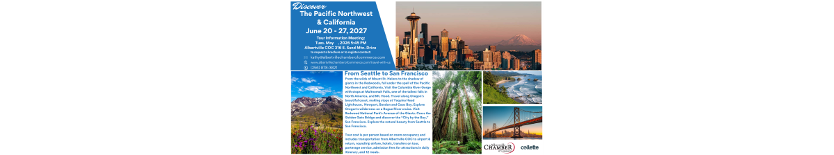 Join us for an informational tour presentation of our first ever Chamber Travel U.S. Tour of the Pacific Northwest & California. Jack Brinson of Collette Travel will be on hand to provide a video presentation of the tour, the daily itinerary, and answer your questions.